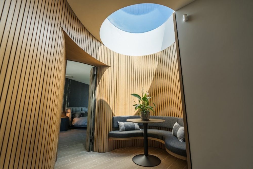 Once inside the property, you’re met with a beam of natural light flooding in from the ceiling, courtesy of a stunning circular rooflight that illuminates a modern sitting area outside of the master bedroom.